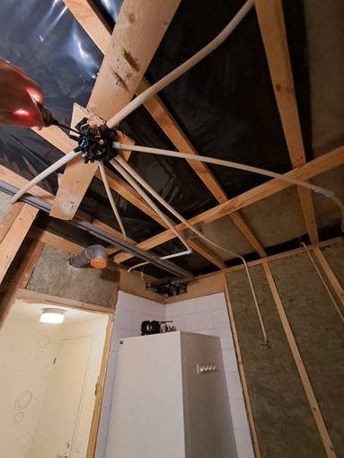 Purkamisen jälkeen lattia hiottiin, uusittiin lattialämmitys, lattiakaivot ja tehtiin uusi kaatovalu lämpölattiamassalla. Seinien ja kattojen ollessa auki uusittiin myös käyttövesijohdot kylpyhuoneosastolle ja hieman muuteltiin sähköjä ja päivitettiin ne nykyvaatimusten mukaisiksi asentamalla vikavirtasuojat. Tässä kohteessa ne saatiin sopimaan mukavasti ryhmäkeskukseen eteiseen.