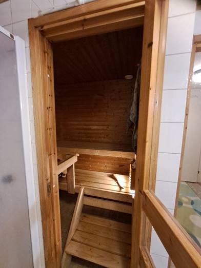 Alas laskettu katto uusittiin. Pintamateriaaliksi tuli, niin alakattoon kuin saunan seiniin ja saunan kattoonkin, valkoisella saunasuojalla käsitelty kuusipaneeli. Uudet lauteet tehtiin lämpökäsitellystä haavasta ja kiuas vaihtui myös etäohjattuun malliin. Myös lämminvesivaraaja vaihdettiin uuteen ja pesuhuoneesta jätettiin pesuallas pois, mutta sellaisen saa helposti takaisin halutessa, koska varaaja on aivan vieressä.
