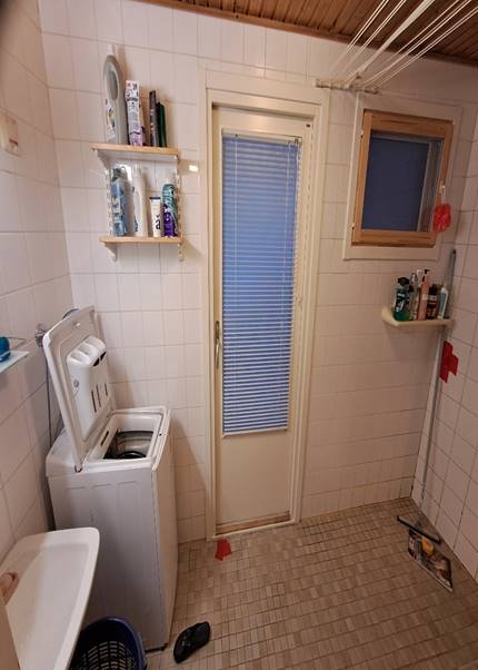 Rakennus on puurunkoinen, joten seinät levytettiin ja ainoastaan huoneistojen välinen seinä oli betonia, niin siihen tehtiin tasoitus. Tämän jälkeen asennettiin vedeneristeet ja tehtiin laatoitukset saumauksineen.